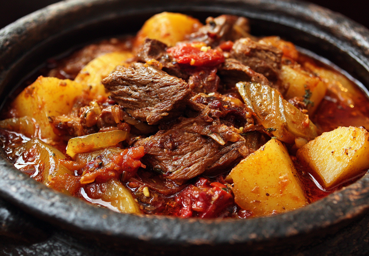 Азу — одно из самых согревающих и насыщенных блюд татарской кухни. Этот густой, наваристый гуляш из мяса и картофеля отличается от других тушеных блюд благодаря своему уникальному кисло-соленому акценту, который дает один секретный ингредиент — соленые огурцы.
