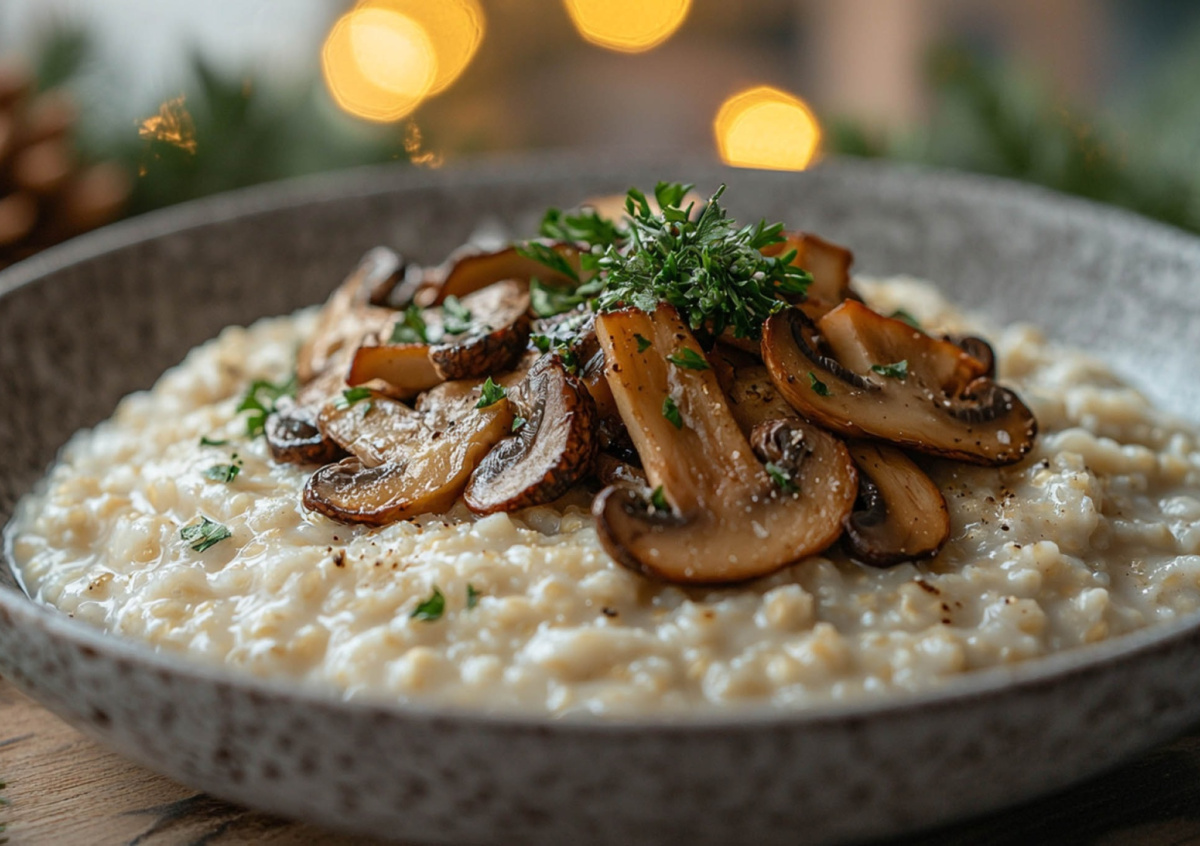 Основой блюда служит 200 граммов пшеничной крупы, которую тщательно промывают и варят в 500 миллилитрах воды до состояния нежной кремовой каши. Вам также понадобится 150 граммов соленых груздей или рыжиков, чайная ложка ароматного трюфельного масла и немного свежей зелени для украшения. Грибы предварительно вымачивают, если это необходимо, затем нарезают соломкой и слегка подсушивают на сухой сковороде. В готовую горячую кашу добавляют трюфельное масло, насыщая ее земляным ароматом. Большую часть грибов аккуратно вмешивают в кашу. Блюдо подают теплым, выложив горкой на тарелку, с оставшимися грибами сверху и сбрызнув еще каплей трюфельного масла.
