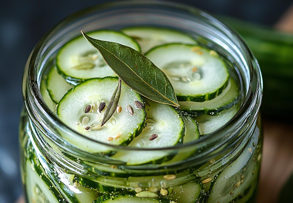 Нарежьте огурцы аккуратными кружочками толщиной около сантиметра. Теперь приготовьте ароматный маринад: в 1,2 литра воды добавьте соль, сахар, горчичные зерна и лаврушку. Доведите до кипения, а потом влейте уксус — так он сохранит свой аромат. Опустите огурцы в кипящий маринад и поварите всего 5 минут, пока они не приобретут нежный оливковый оттенок.