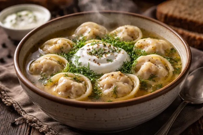 Подавайте в глубоких тарелках с бульоном, в котором они варились, посыпав зеленью и свежемолотым перцем. Сверху — ложка сметаны и зелень.