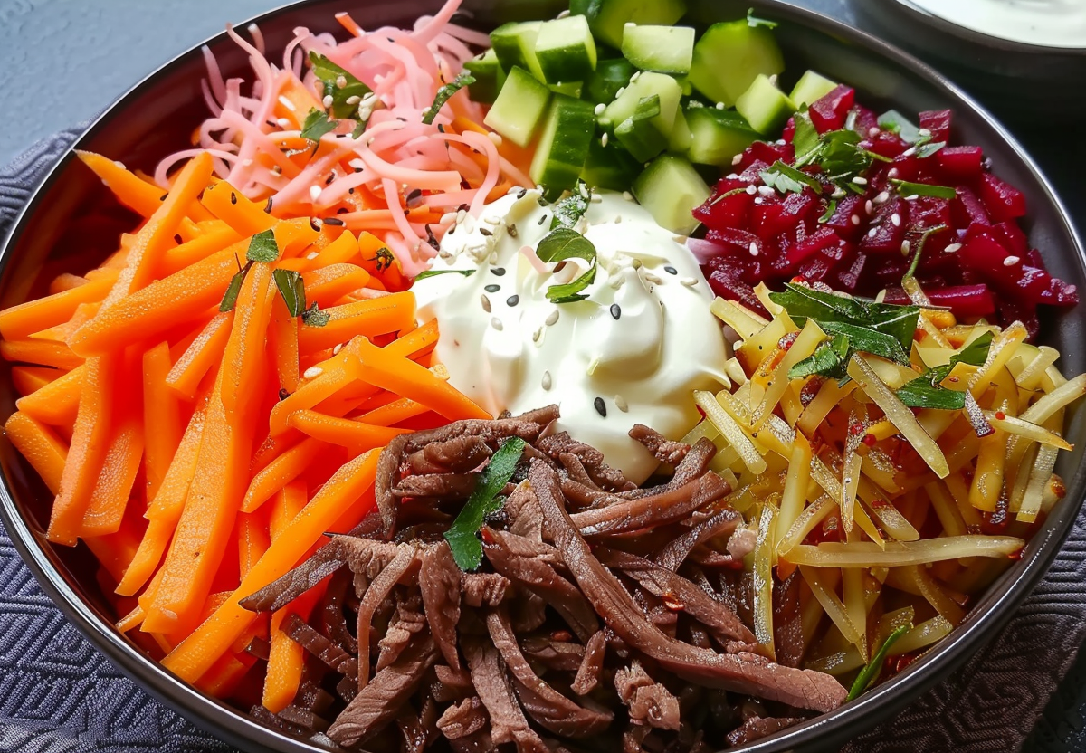 Для основы возьмите примерно 400 г варено-копченого мяса (говядины, свинины или курицы) и нарежьте тонкой соломкой. Добавьте к нему 200 г корейской моркови и столько же корейской свеклы — они дадут пикантность. Вмешайте 400 г тонко нашинкованной свежей капусты, она добавит хруста и баланса. Для акцента всыпьте одну пачку картофельной соломки — можно покупную, но домашняя держит форму дольше.