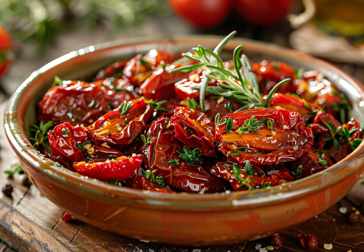 Особенность этого способа вяления томатов — интенсивный средиземноморский вкус с нотами чеснока и трав. Вяленые томаты идеально подходят для антипасто, пасты, пиццы или как самостоятельная закуска. Хранить их лучше в оливковом масле с добавлением каперсов и анчоусов.