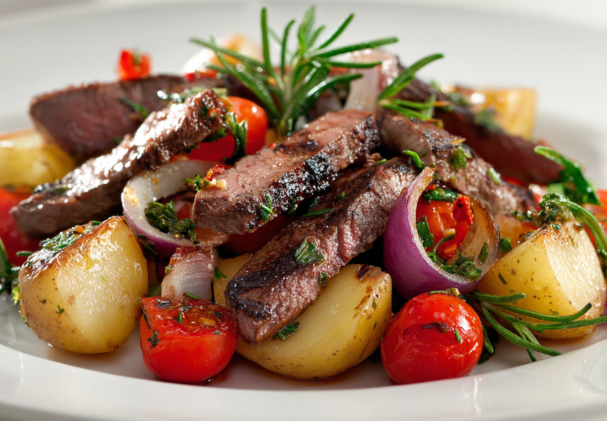 Вам понадобится: говядина (мякоть) — 300 г, картофель — 3 средних клубня, помидоры черри — 200 г, красный лук — 1 небольшая головка, чеснок — 2 зубчика, оливковое масло — 3 ст. л., бальзамический уксус — 1 ст. л., зернистая горчица — 1 ч. л., свежий розмарин или тимьян — по вкусу, соль и черный перец. Говядину нарежьте тонкими полосками и быстро обжарьте на сильном огне до румяной корочки, чтобы она осталась сочной внутри. В этой же сковороде подрумяньте ломтики отварного картофеля, добавьте лук перьями, чеснок, разрезанные пополам черри и травы, влейте смесь масла, уксуса и горчицы, быстро прогрейте и сразу подавайте.