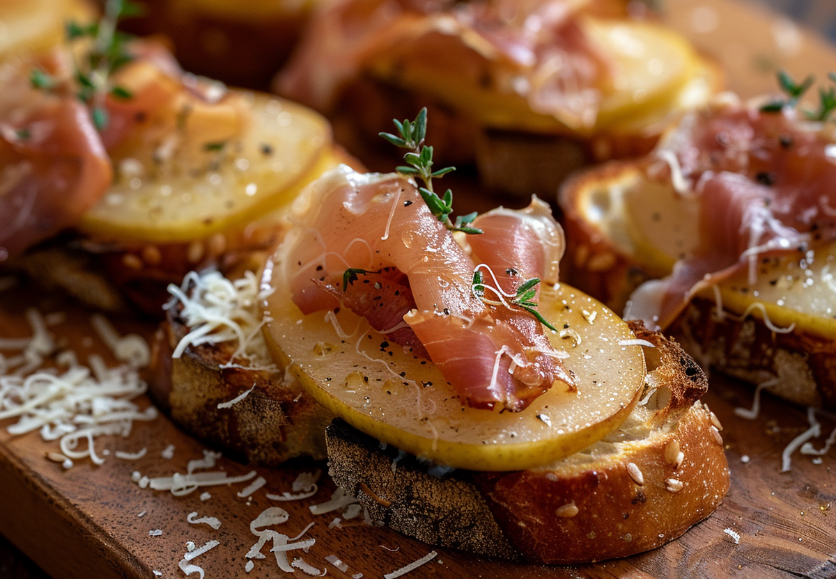 Для приготовления используют половину крупной сладкой груши, 40 г пармезана, 70 г прошутто и чайную ложку лимонного сока. Грушу нарезают тонкими ломтиками и слегка сбрызгивают лимонным соком, чтобы сохранить цвет. На небольшие багетные тосты или канапе-основу выкладывают по ломтику груши, сверху — стружку пармезана и маленький аккуратный кусочек прошутто. При желании добавляют каплю меда или листик тимьяна, чтобы подчеркнуть сладость фрукта.