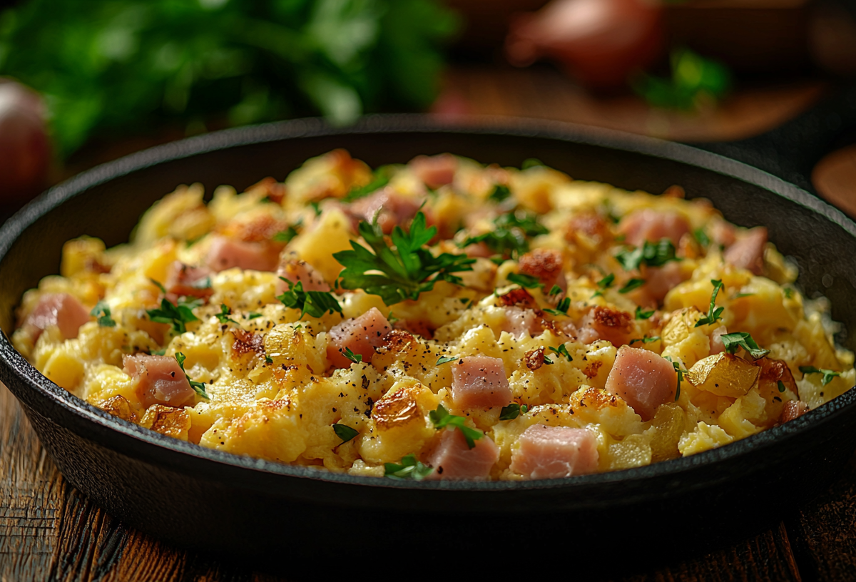 Основу блюда составляют отваренный картофель (3–4 шт.), ветчина или любое отварное мясо (200 г), репчатый лук (1 головка), яйца (3–4 шт.), сливочное или растительное масло для жарки (2–3 ст. л.), соль и перец по вкусу. По желанию можно добавить сливки или молоко (100 мл) для нежности, а также свежую зелень для яркости.