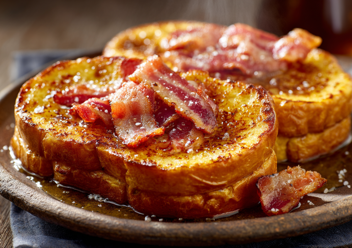 Как готовить. Яйца взбивают с молоком, солью, перцем и дижонской горчицей — она дает легкую остроту и делает яичную смесь шелковистой. Ломтики хлеба опускают в смесь на 30 секунд с каждой стороны. На сковороде разогревают масло и жарят хлеб по 2–3 минуты до золотистой корочки. Бекон обжаривают отдельно на сухой сковороде до хруста — буквально 1–2 минуты. Горячие гренки выкладывают на тарелку, сверху кладут бекон.