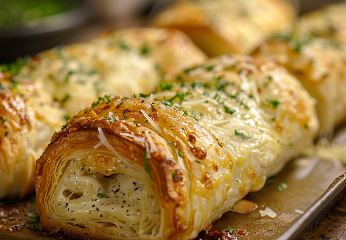 Возьмите упаковку слоеного теста, лучше дрожжевого. Раскатайте его в тонкий прямоугольник. Натрите на мелкой терке два плавленых сырка и смешайте их с двумя измельченными зубчиками чеснока и парой столовых ложек майонеза или сметаны до получения однородной кремообразной массы. Если у вас есть зелень, мелко ее порубите и добавьте в сырную массу для свежести. Равномерно намажьте полученной пастой весь пласт теста. Теперь туго сверните тесто в рулет, стараясь не оставлять пустот. Поместите на противень, застеленный бумагой, и выпекайте в духовке при 200 градусах примерно 20–25 минут, пока он не подрумянится. Дайте ему немного остыть перед нарезкой.