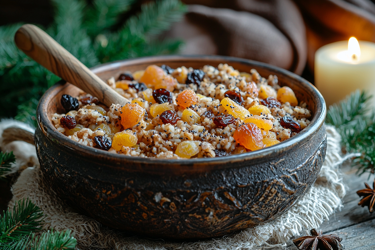 Замочите 200 г пшеницы на ночь, затем сварите до мягкости в 1 л воды около 40 минут. Измельчите в блендере или пропустите через мясорубку для нежной текстуры. Добавьте 100 г толченого мака, замоченного в горячей воде, и 150 г мелко нарезанных кураги, изюма, чернослива. Слегка подсластите медом или сиропом по вкусу. Перемешайте и дайте настояться 20 минут — сочиво на сочельник готово!