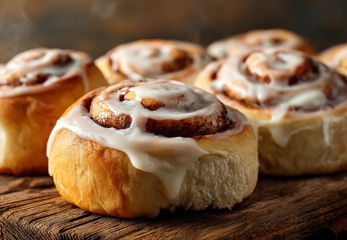 Булочки выкладывают в форму, дают подойти и выпекают при 180 градусах около 25 минут. Готовые синнабоны с корицей покрывают сливочной глазурью — она плавится от тепла и делает булочки особенно нежными. Этот десерт сохраняет мягкость и на следующий день, оставаясь насыщенно ароматным.