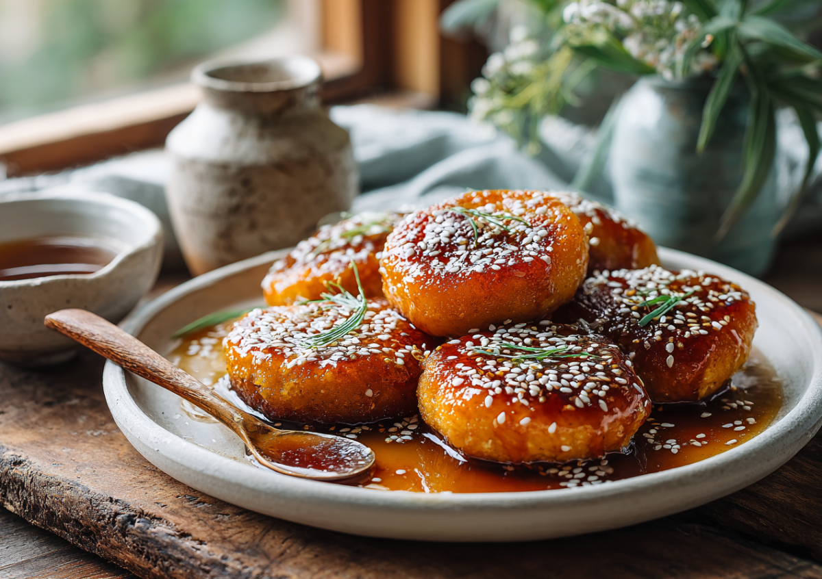 Вам потребуется: 500 г отварной моркови, 70 г манной крупы, 50 г сахара для теста, щепотка кардамона, 30 г сливочного масла. Для сиропа: 100 мл воды, 100 г сахара, 20 г свежего имбиря, 1 ст. л. лимонного сока. Отварную морковь натрите на мелкой терке. Смешайте с манкой, сахаром (50 г) и кардамоном. Дайте смеси постоять 15 минут. Сформируйте небольшие лепешки и обжарьте на сливочном масле до золотистого цвета. Для сиропа смешайте воду, сахар (100 г), натертый имбирь и лимонный сок. Проварите 5–7 минут. Горячие медальоны полейте сиропом и дайте им пропитаться 2 минуты. Подавайте теплыми, посыпав кунжутом.