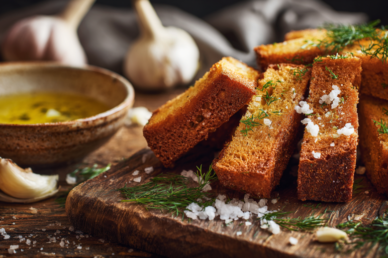 Секрет идеальных домашних гренок — в правильном хлебе и ароматном масле. Лучше всего брать слегка подсохший ржаной или бородинский хлеб: свежий батон впитает слишком много жира и превратится в вату. Хлеб нарезают продолговатыми брусками. В сковороде растапливают смесь сливочного и оливкового масла — это предохраняет молочные жиры от пригорания. Чеснок раздавливают ножом, мелко рубят и на минуту опускают в теплое масло, чтобы отдать аромат, а затем сразу удаляют, иначе он сгорит и даст горечь. В это масло выкладывают хлеб и обжаривают со всех сторон до золотистой хрустящей корочки. Горячие гренки выкладывают на бумажное полотенце на минуту, а затем, пока они еще теплые, обваливают в смеси мелко рубленого укропа и крупной морской соли. Подают слегка остывшими.