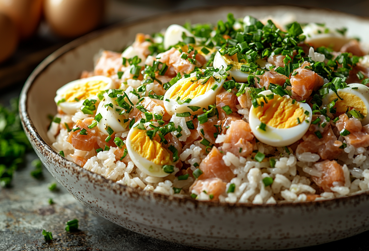 Для приготовления салата понадобится печень трески — 200 г, рис — 25 г, яйца — 2 шт., репчатый лук — 40 г, зеленый лук — 20 г, петрушка — 15 г и соль по вкусу. Сначала сварите яйца вкрутую и очистите их, затем измельчите. Рис тщательно промойте и отварите до готовности. Репчатый лук очистите и мелко порежьте, зеленый лук и петрушку промойте и нарежьте. Печень трески извлеките из масла и разомните вилкой. Выложите в салатник печень, яйца, лук и зелень, добавьте соль по вкусу и аккуратно перемешайте. При желании добавьте масло из-под печени или майонез для мягкости вкуса. Салат можно подать порционно или в общем блюде, он отлично подойдет как легкая закуска или дополнение к основному блюду.