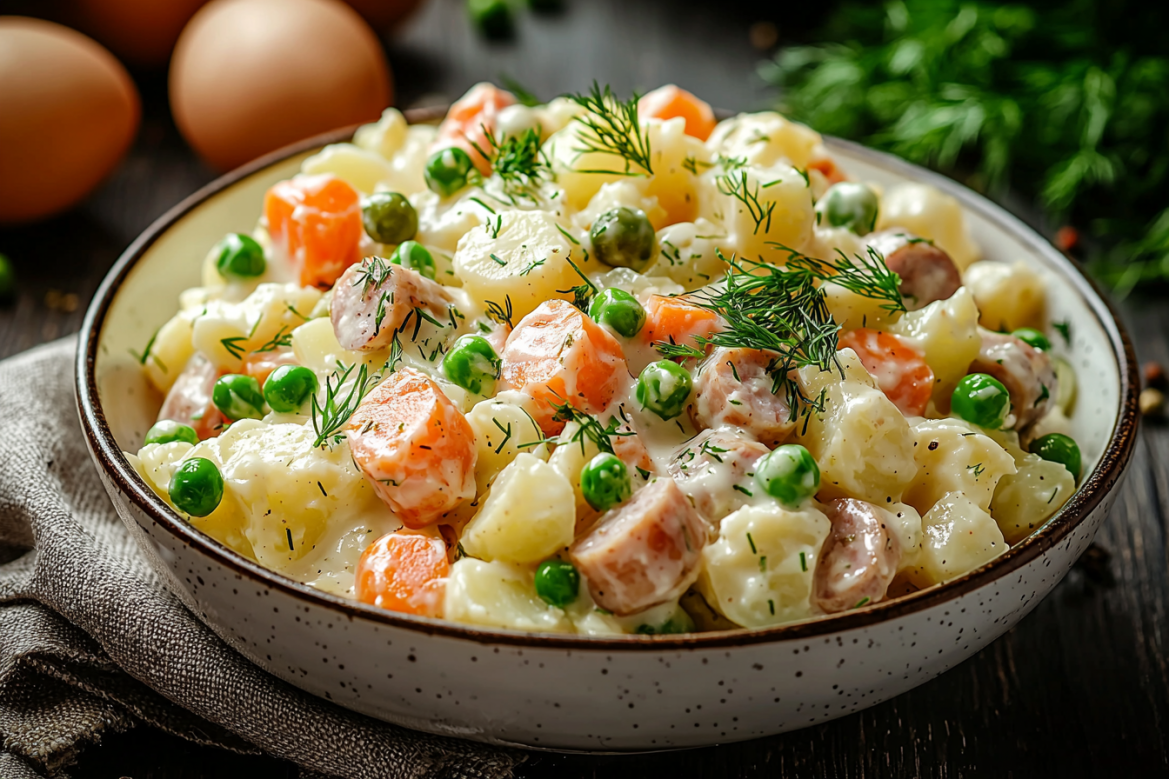 Оливье по праву считается главным праздничным салатом, а его вариации позволяют каждый раз открывать новое сочетание вкусов. Версия с двумя видами колбасы — вареной и копченой — делает закуску особенно ароматной и насыщенной.