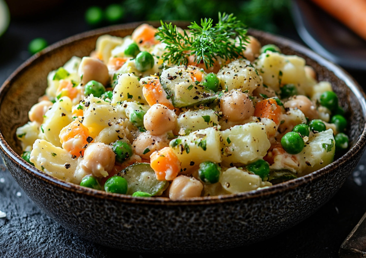 Этот вариант оливье сохраняет тот самый узнаваемый вкус салата из детства, но обходится без колбасы, яиц и тяжелого майонеза. Такой салат понравится и тем, кто придерживается растительного питания, и тем, кто просто ищет более легкую версию любимой закуски.