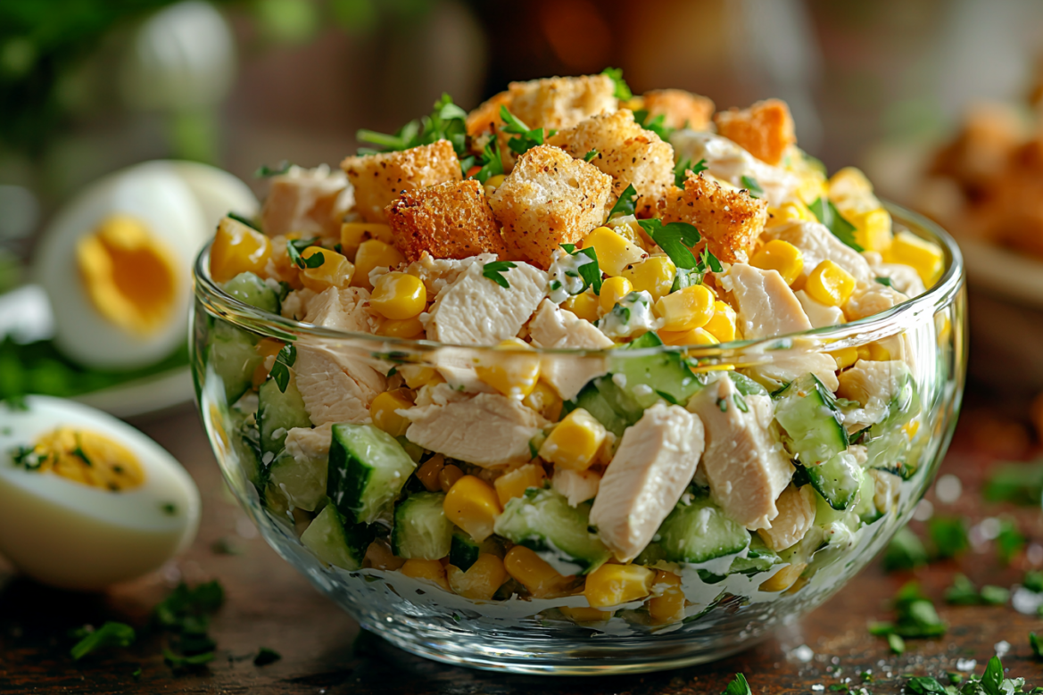 Мягкая курица, сладкая кукуруза, сочные овощи и хрустящие сухарики — быстрое и красивое блюдо.
