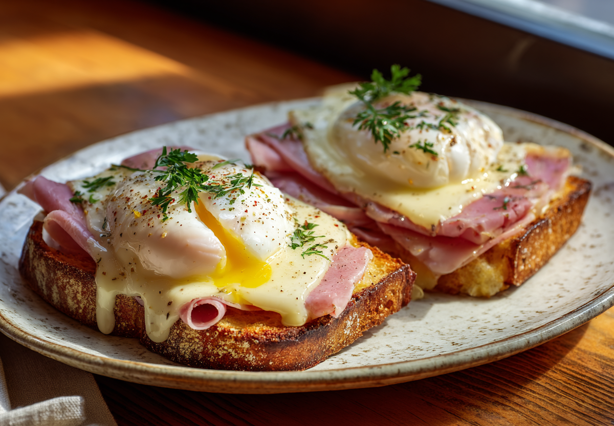 Секрет изысканности этого блюда — в нестандартном соусе. Вместо привычного бешамеля мы используем редкий для этого рецепта сырно-горчичный крем на основе сливок, который рекомендует повар с мишленовским опытом. Он готовится моментально и дарит начинке невероятную бархатистость. А яйцо-пашот вместо жареной глазуньи — это малораспространенный, но гениальный ход для романтического ужина на скорую руку, делающий блюдо более утонченным и легким.