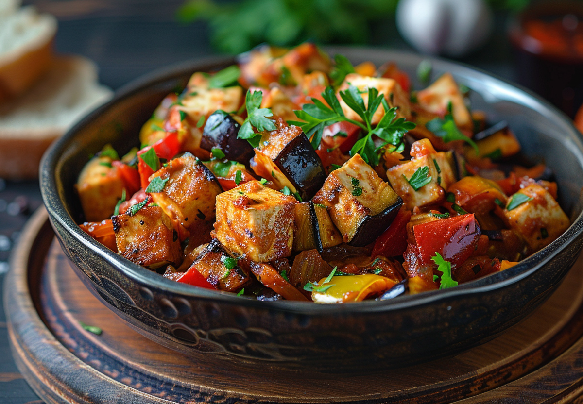 Нарежьте баклажан (1 шт.), кабачок (1 шт.), болгарский перец (2 шт.) и помидоры (2 шт.) кубиками. Обжарьте на оливковом масле (2 ст. л.) с луком (1 шт.) и чесноком (2 зубчика) 5 минут. Добавьте тофу (150 г, нарезать кубиками) — он впитает вкусы и даст белок (140 ккал/порция). Тушите 10 минут под крышкой с тимьяном, солью, перцем и бальзамическим уксусом (1 ч. л.) для кислинки. Готовьте до мягкости овощей. Для романтического ужина разложите по тарелкам, посыпьте петрушкой и подайте с багетом или кускусом. Добавьте свечи и тихую музыку — магия обеспечена.