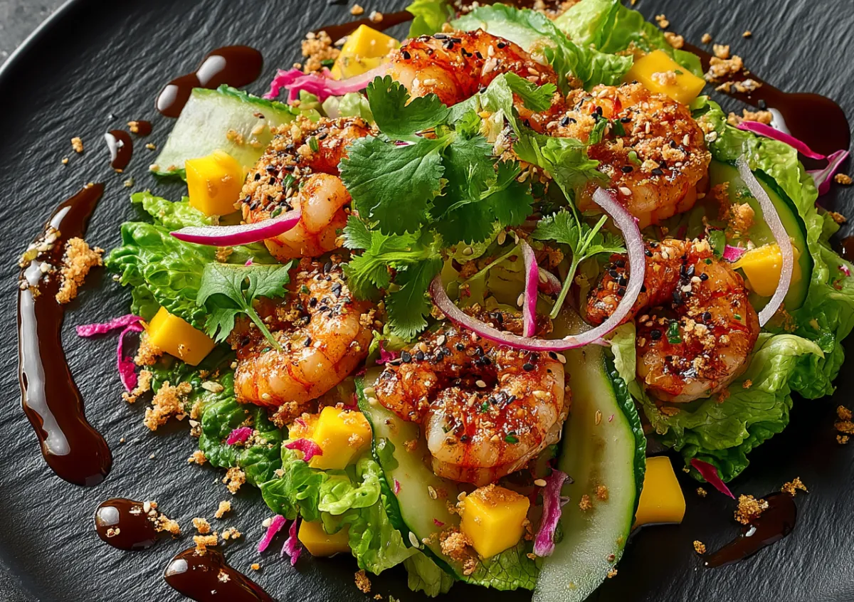 Азиатский салат с креветками, манго и ферментированным имбирем