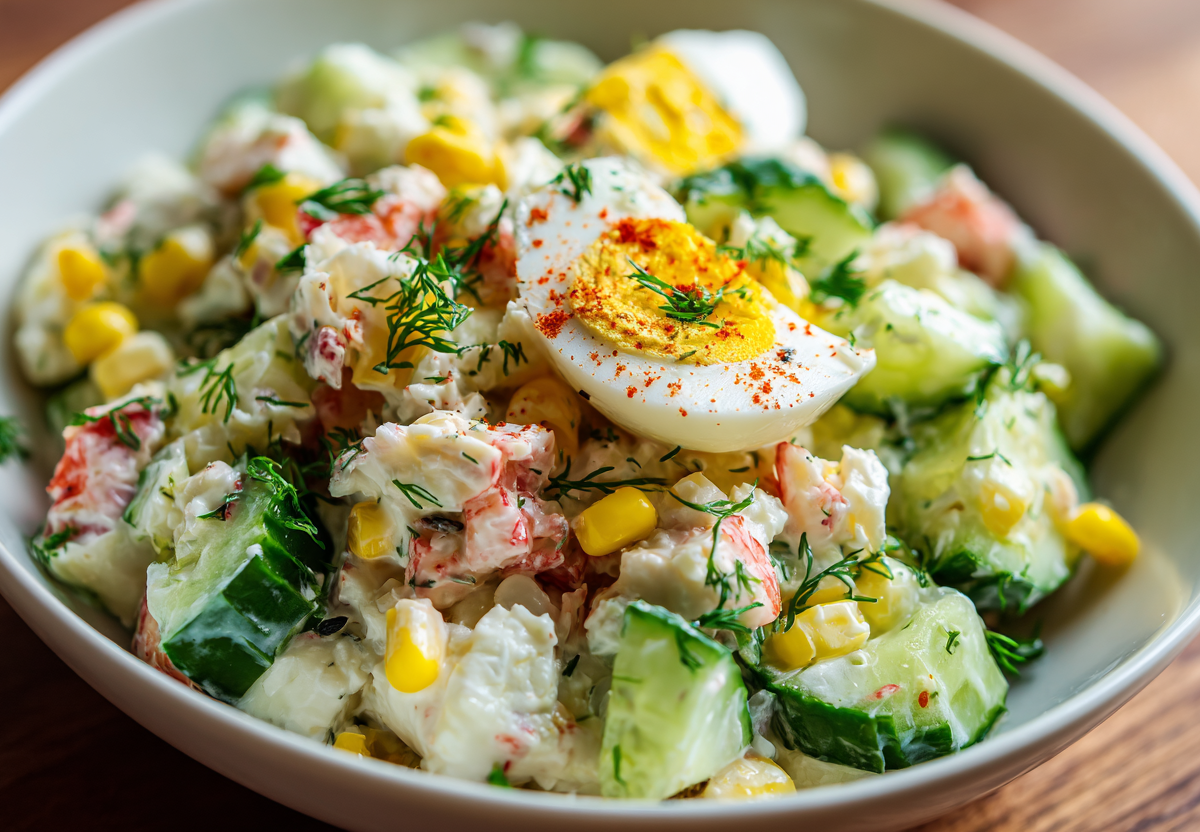 Крабовый салат без риса получается свежим, хрустящим и легким. В нем сохраняется узнаваемый вкус, но структура становится воздушнее. Для приготовления используют 200 г крабовых палочек, 3 вареных яйца, 1 свежий огурец, 150 г консервированной кукурузы, 2 ст. л. майонеза, немного соли и перца.