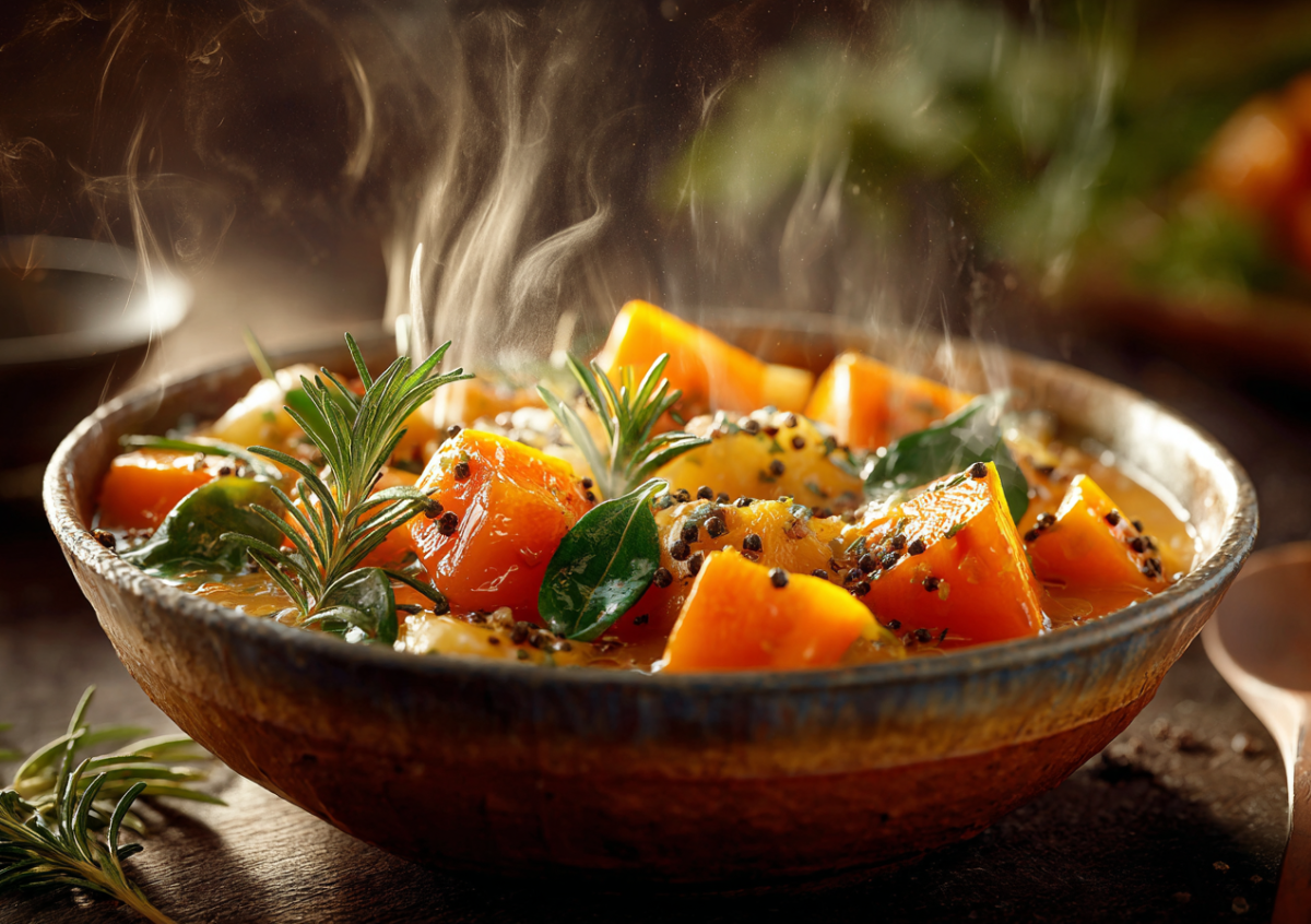500 г нежной тыквы и 1 корень сельдерея нарежьте компактными кубиками. Разогрейте в сотейнике столовую ложку кокосового масла, обжарьте до мягкости 300 г мелко порубленного репчатого лука и слегка запеките. Влейте 100 мл овощного бульона, тушите под крышкой на медленном огне 20 минут, пока тыква не станет мягкой. За пару минут до готовности положите горсть свежего шпината и немного измельченного имбиря для согревающего эффекта. Подавайте блюдо, украсив его веточкой розмарина. Это рагу насыщено клетчаткой, дарит длительное чувство сытости и заряжает энергией.