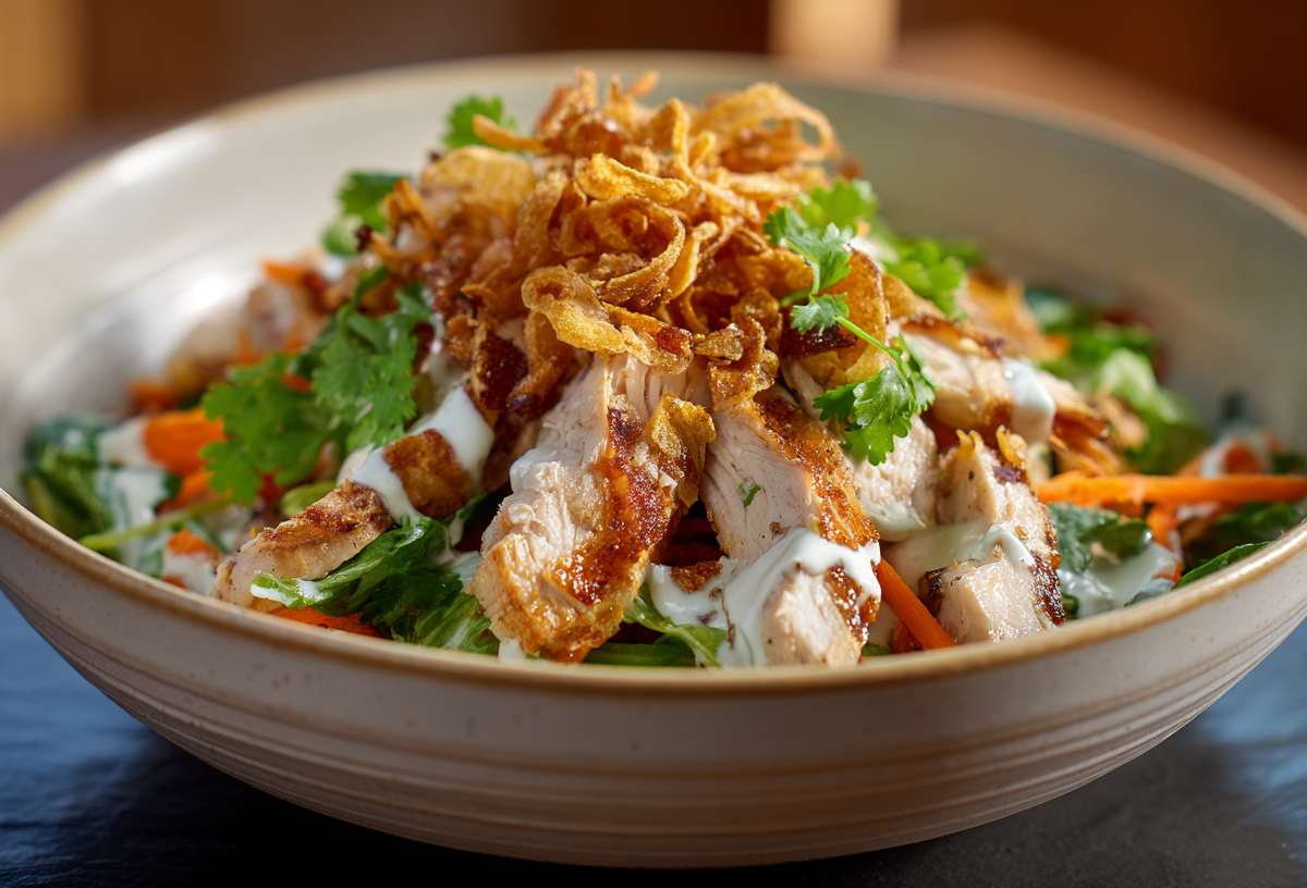 Курицу (грудка — 300 г) нарежьте тонкой соломкой. Смешайте ее с корейской морковью (200 г). Отдельно соедините йогурт (натуральный, без сахара — 120 г), горчицу (1 ч. л.) и перец (щепотка), затем заправьте салат. Перед подачей посыпьте хрустящим луком (жареный — 80 г), чтобы он сохранил текстуру.