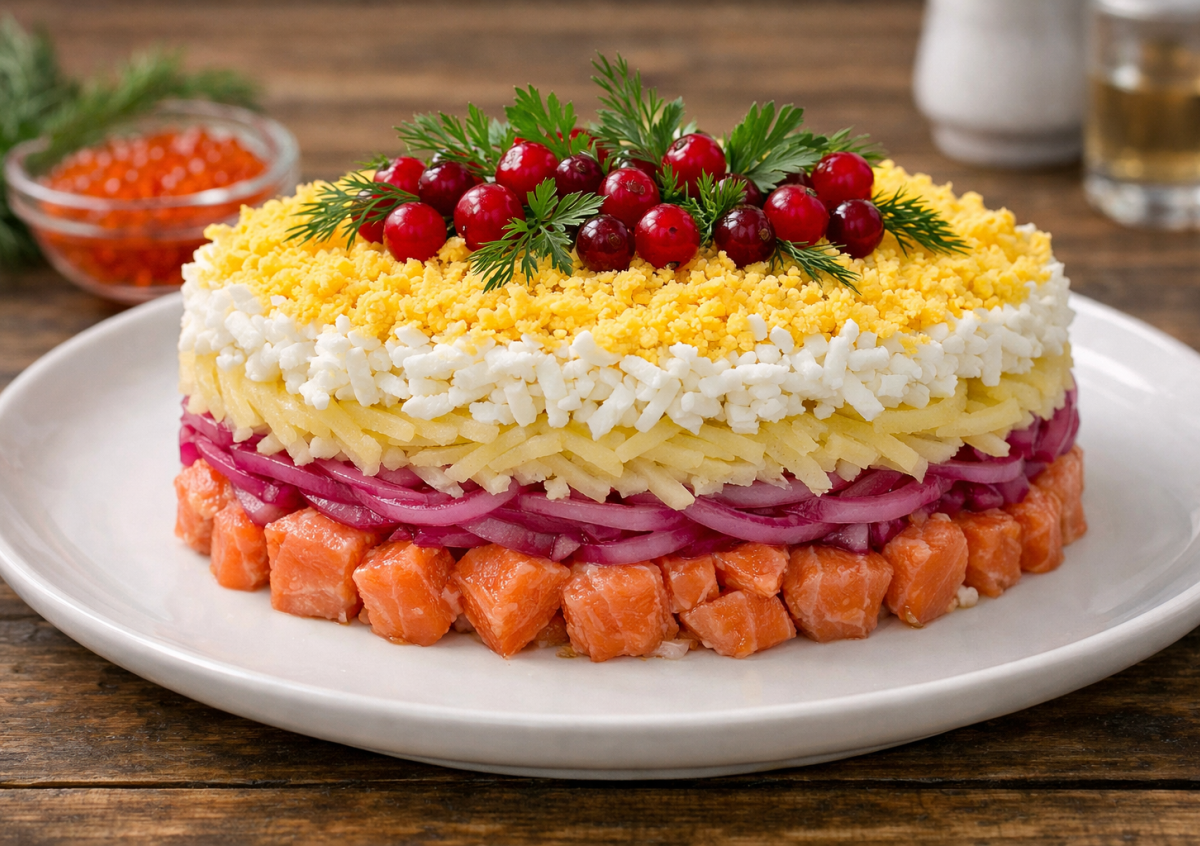 Теперь магия сборки в кольце: стартуйте с семги как основы роскоши, сверху разложите маринованный лук для хрусткой искры, затем картофель с тонкой сеткой майонеза, чтобы связать вкусы. Далее — яблоки, щедро смазанные майонезом, — они добавят сладкой кислинки. Пятым слоем — белок под легким майонезом для нежности, а венец — желток, яркий и соблазнительный. Сверху посыпьте свежей зеленью и яркими ягодами — салат готов к триумфу на столе!