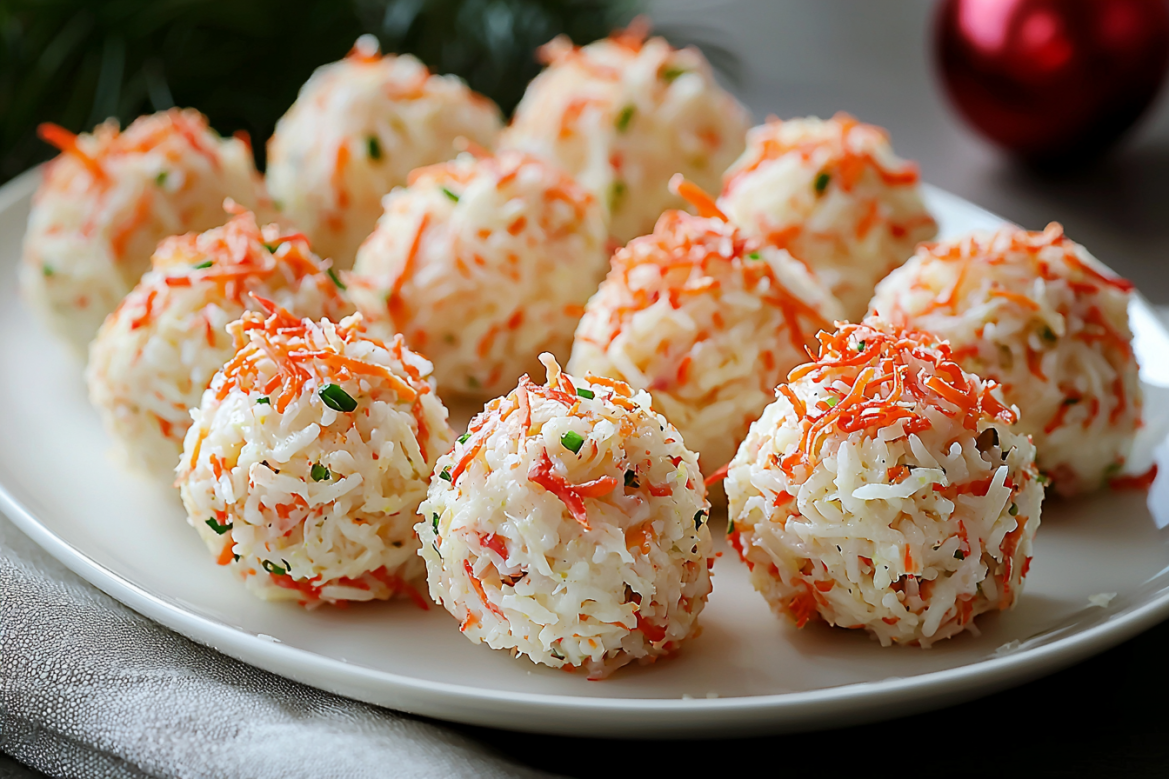 Рис, сыр и крабовые палочки соединяют в пластичную массу, формируют шарики и обваливают в крабовой стружке. После короткого охлаждения закуска держит форму и смотрится аккуратно на общем блюде.