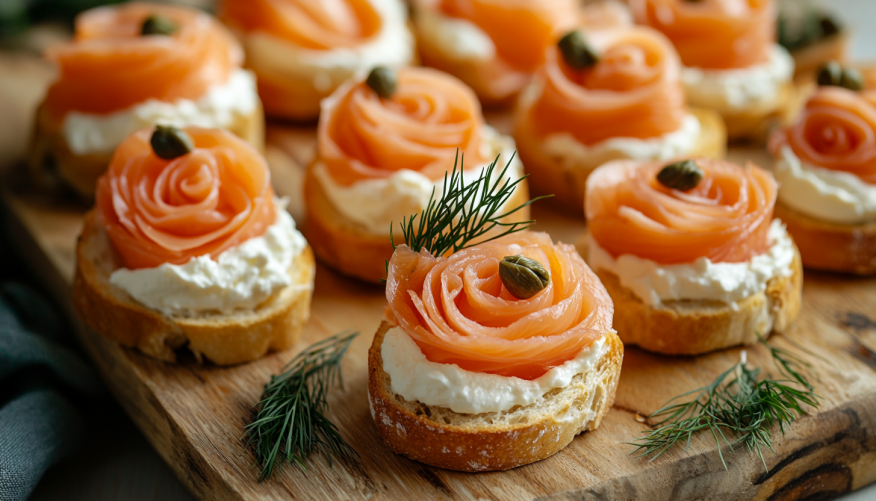 Ищете быструю и беспроигрышную закуску? Праздничные бутерброды с красной рыбой — это всегда актуально. Для базового варианта понадобится: 200 граммов слабосоленой семги или форели, 150 граммов сливочного сыра, половинка лимона, укроп и багет или черный хлеб.