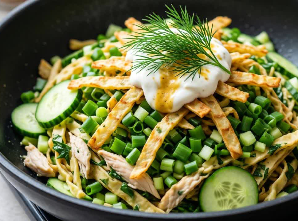 Нарежьте 3-4 готовых тонких блина неширокими полосками, как лапшу. Обжарьте их на сухой сковороде или с каплей масла до легкого хруста — буквально 2–3 минуты, постоянно помешивая. Отварите одно куриное филе, остудите и разберите на волокна или нарежьте кубиками. Один свежий огурец нарежьте тонкой соломкой, а пучок зеленого лука и пучок укропа мелко порубите.