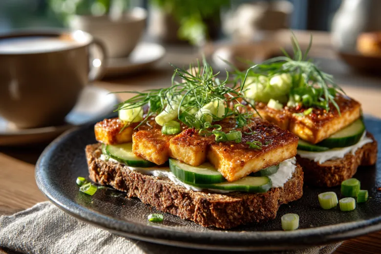 Секрет этого блюда — в правильной обжарке тофу. Чтобы он не был пресным, нарежьте его пластинками, обваляйте в смеси паприки, чеснока и щепотки соли, а затем обжарьте на растительном масле до золотистой корочки. Возьмите любимый хлеб (отлично подойдет ржаной или бородинский), смажьте его сливочным сыром. Выложите сверху кружочки свежего огурца и горячий тофу. Добавьте пару перьев зеленого лука для пикантности.