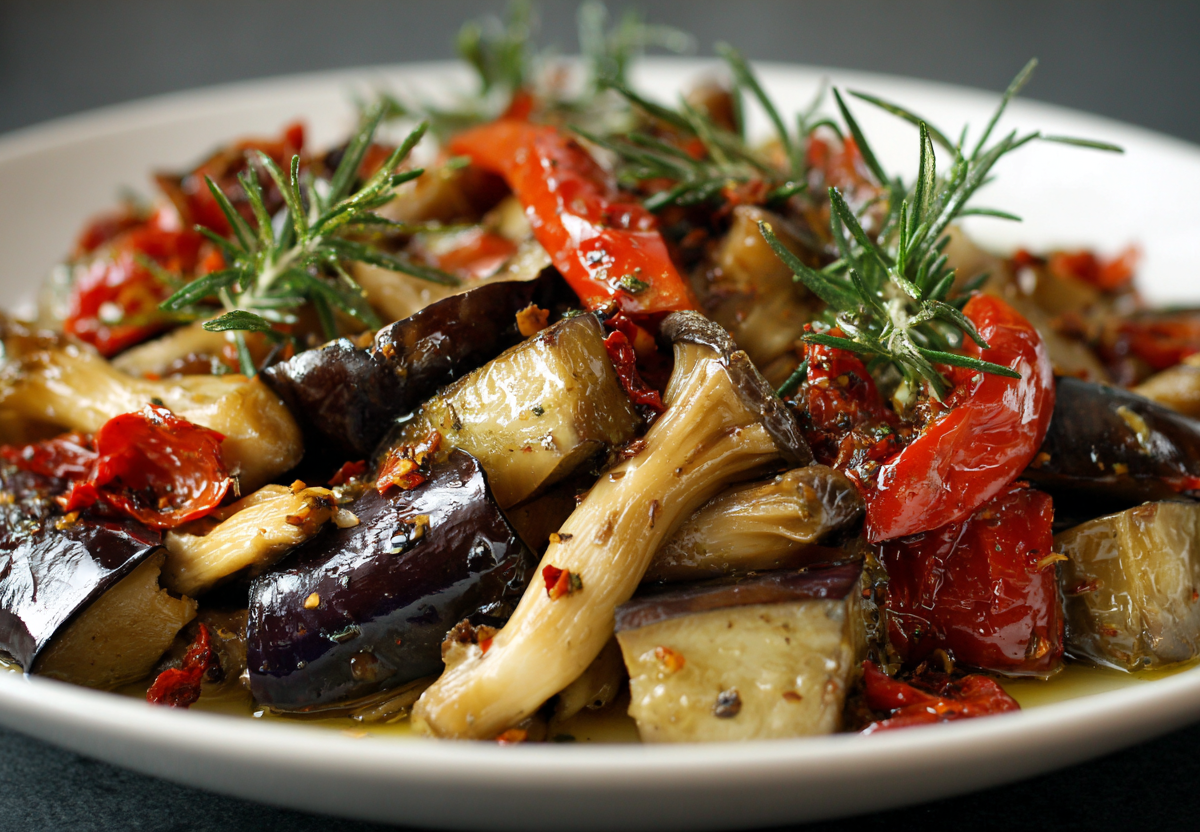 Целые баклажаны и перцы запеките в фольге до мягкости, очистите и нарежьте крупными полосками. Вешенки обжарьте с чесноком и розмарином, в конце присыпьте паприкой. Соедините все компоненты, добавьте нарезанные вяленые томаты и аккуратно перемешайте. Подавайте немедленно.