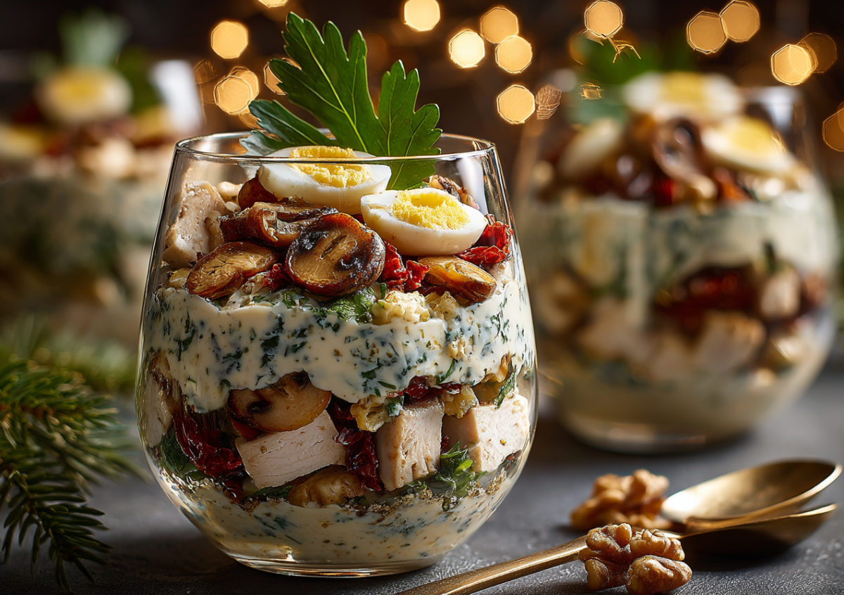 Такой салат идеально впишется в низкоуглеводное меню на Новый год, сохранит праздничный вкус и легкость. Подавайте его в мини-бокалах — это красиво, удобно и полезно для фигуры.
