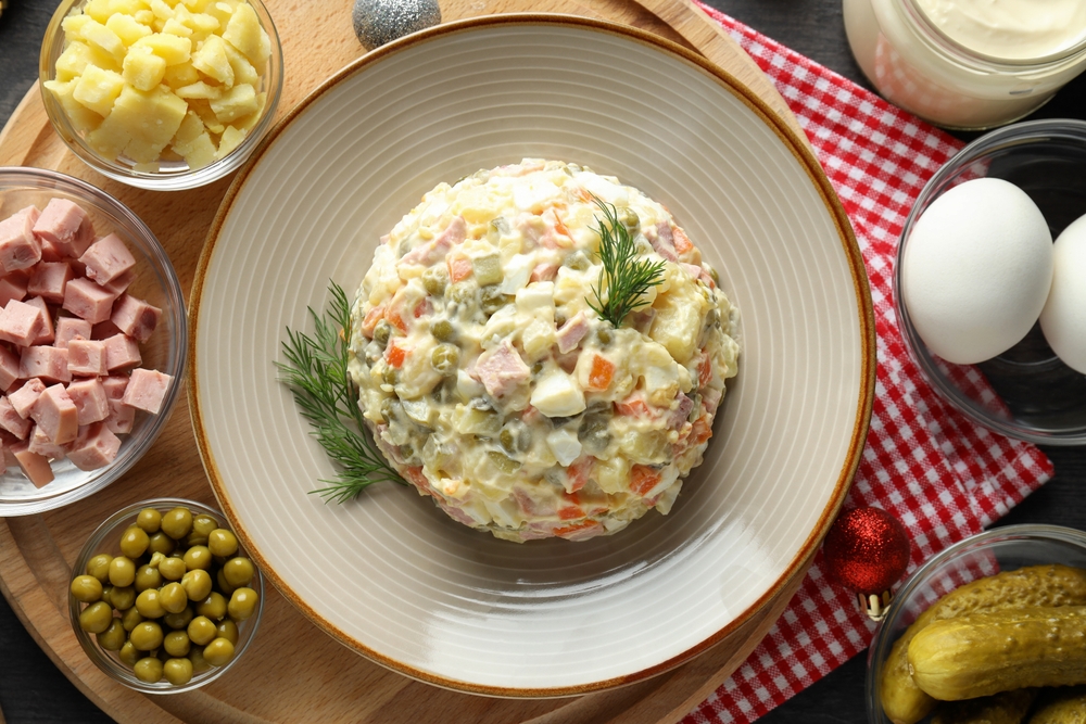 Тот самый салат, без которого не обходился ни один новогодний стол в СССР. Строгая рецептура по ГОСТу, вареная колбаса докторская, яйца, огурчики и зеленый горошек.