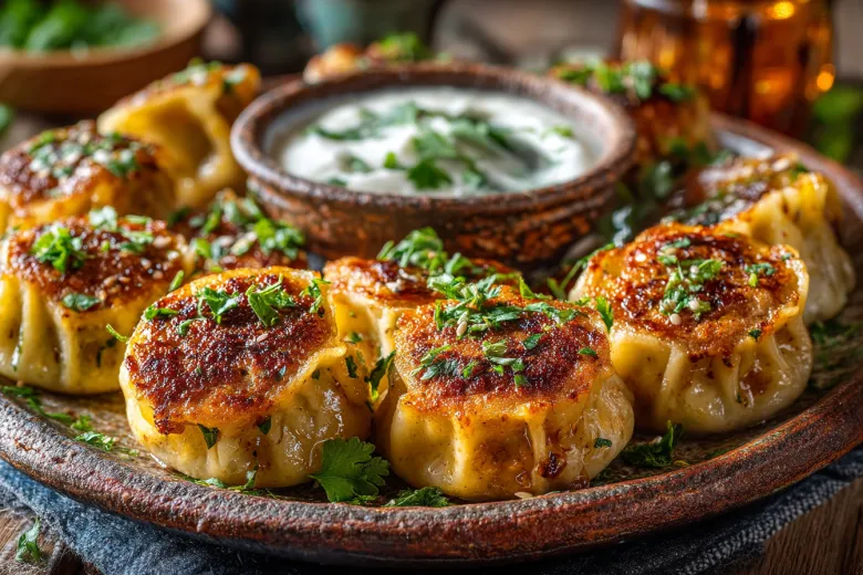 Сначала обжаривают начинку: лук до золота, затем фарш и тертый помидор до выпаривания жидкости. В конце добавляют зелень. Тесто раскатывают тонко, режут на квадраты 5х6 см, выкладывают начинку и защипывают края, оставляя верх открытым. Эти «лодочки» ставят в кастрюлю вертикально, заливают горячим бульоном до половины и томят под крышкой 20 минут. Финальный аккорд — легкое обжаривание на сливочном масле до румяной корочки. Готовые пельмени подают с мацони (или густым кефиром) и чесноком.