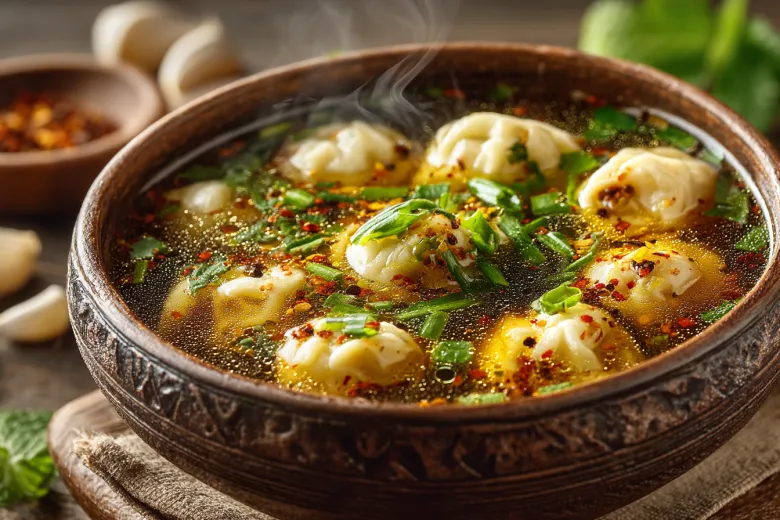 Такие пельмени подают с бульоном и зеленью. Получается ароматное, легкое и удивительно уютное блюдо, которое быстро становится любимым на домашней кухне.