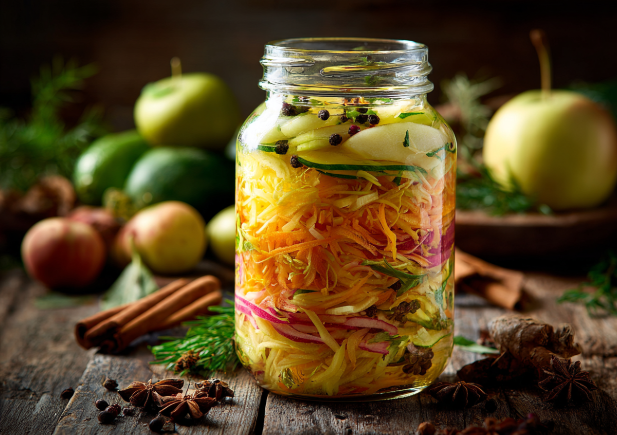 Для приготовления нашинкуйте два овоща плотной структуры. Возьмите три крупных фрукта, например сорта «гренни смит», и нарежьте их слайсами, не снимая кожуры для яркого вкуса. Одну часть корнеплода измельчите на крупной терке. В глубокой миске осторожно смешайте овощи и фрукты, добавив столовую ложку свеженатертого имбиря для пикантной теплоты. Распределите смесь по чистым банкам, перекладывая слои пятью бутонами гвоздики и двумя звездочками бадьяна. Маринад приготовьте из одного литра воды, двух ложек соли, 150 граммов тростникового сахара и 200 миллилитров натурального яблочного уксуса. Доведите до кипения, залейте и сразу закрутите. Укутанные в одеяло банки должны медленно остыть, чтобы специи полностью отдали свой аромат.
