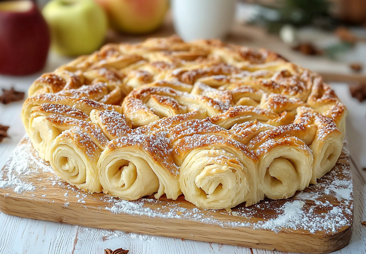 Ароматный пирог с яблоками — классика домашней выпечки. Этот рецепт отличается оригинальной подачей: тесто сворачивается в виде рожков, наполняется сочной начинкой и запекается до золотистой корочки. Идеально подходит для уютных чаепитий и домашних посиделок!