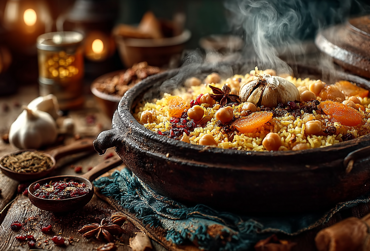 Нут замачивают на ночь и отваривают до мягкости. В казане прогревают масло, обжаривают лук и морковь, добавляют специи. Кладут дольки айвы — редкий для плова акцент, который дает легкую кислинку и плотную текстуру. Всыпают рис, нут, заливают водой и томят под крышкой 20–25 минут без перемешивания.