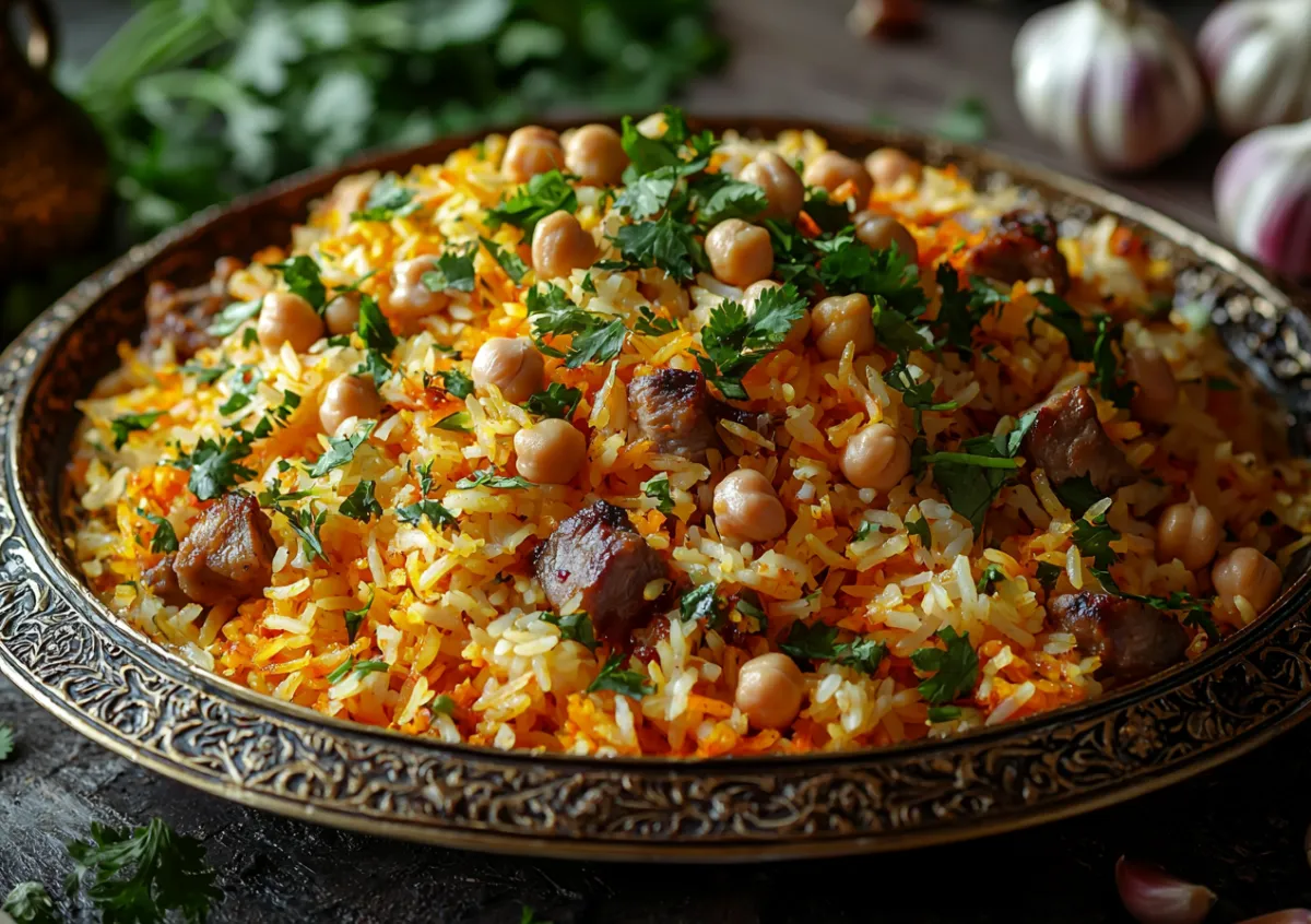В почти готовый рис воткните барбарис. Затем соберите рис горкой к центру, плотно накройте крышкой и томите на минимальном огне 25–30 минут. Этот этап позволяет рису «дойти» на пару, становясь рассыпчатым. Готовый плов бережно перемешайте снизу вверх, выкладывая на большое блюдо. Сверху разложите куски мяса, нута и запеченный чеснок.