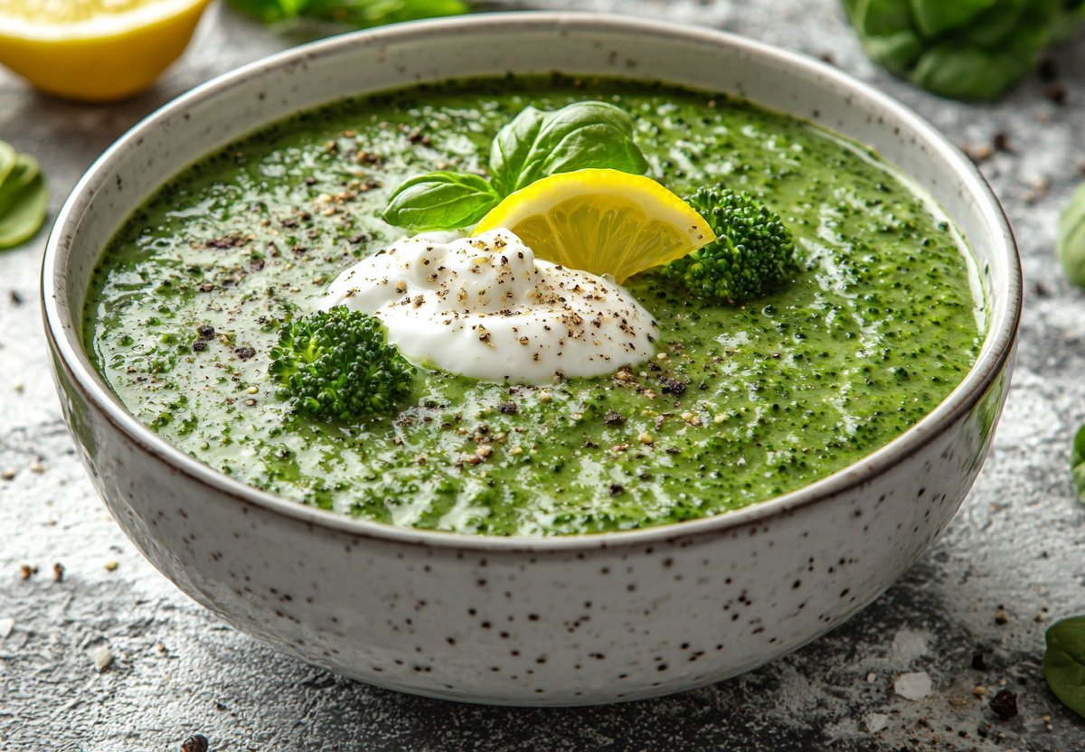 Начинаем с нарезки 200 г брокколи на соцветия и 100 г свежего шпината. В кастрюле разогреваем 1 ст. л. оливкового масла, добавляем мелко нарезанную луковицу и слегка обжариваем. Заливаем 1 л овощного бульона, добавляем брокколи и варим 10 минут. В конце добавляем шпинат и варим еще 3–5 минут до мягкости. Приправляем солью, перцем и щепоткой мускатного ореха. Можно подавать с долькой лимона для свежести.