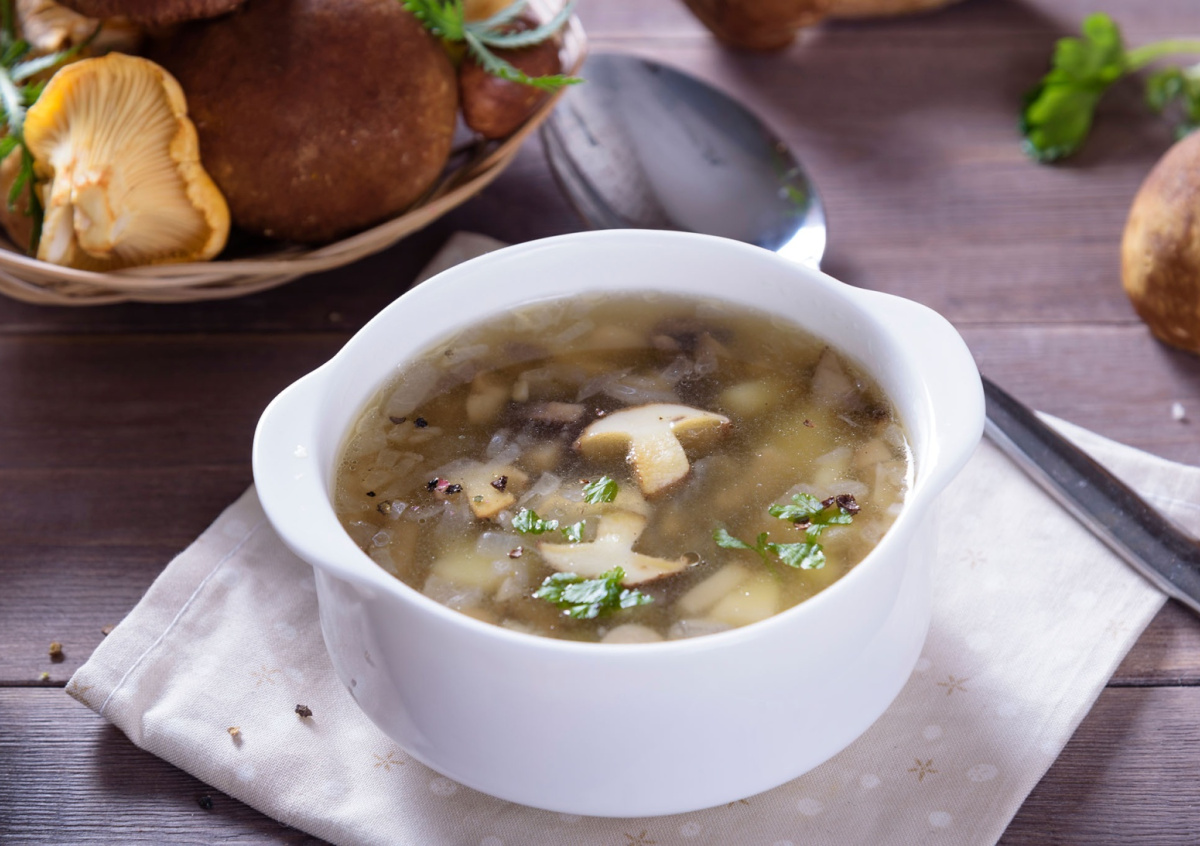 Замочите 100 г сушеных грибов на час в теплой воде, потом отварите до мягкости. Нарежьте 2 луковицы, 2 моркови и 3 картофелины кубиками. Обжарьте овощи на растительном масле в кастрюле, добавьте грибы с отваром и картошку. Влейте 1,5 л воды, посолите, поперчите и варите 20 минут под крышкой. Для густоты вмешайте 2 ст. л. муки, разведенной водой, и проварите еще 5 минут. В конце бросьте пучок укропа и зелени — аромат разнесется по дому. Получится 4 порции насыщенного бульона с нежным вкусом.