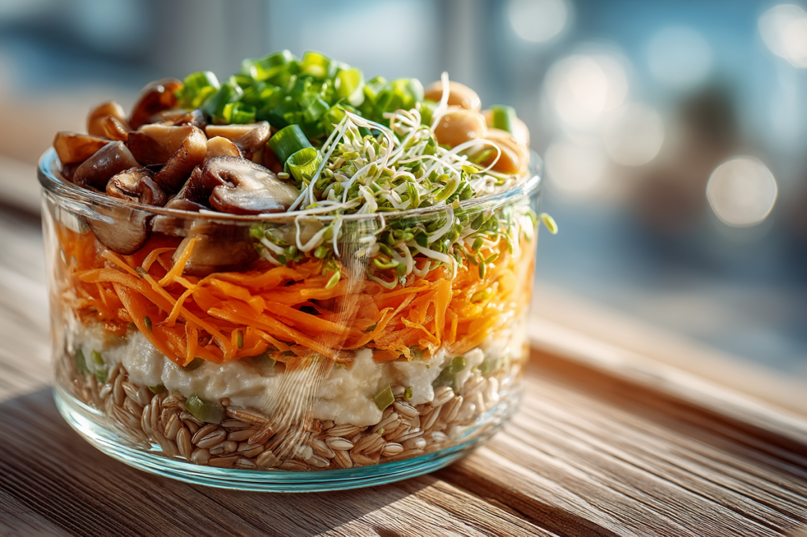 Салат собирают слоями: пророщенная пшеница → грибы → тонкий слой моркови → фасоль → зеленый лук. Перед подачей блюду дают настояться 10–15 минут, чтобы вкусы соединились.