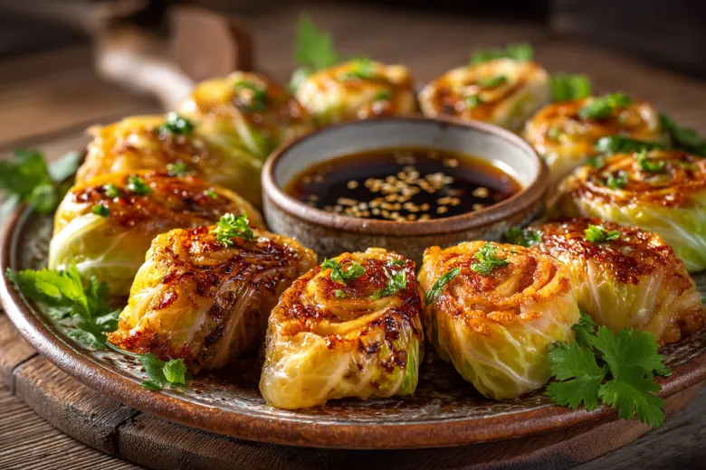 На каждый лист выложите порцию начинки, заверните конвертом или трубочкой, подгибая края внутрь. Получившиеся роллы обжарьте на сковороде с небольшим количеством масла с двух сторон до золотистой корочки. Каждый ролл должен стать румяным и хрустящим снаружи, а внутри остаться сочным. Подавайте с соусом: смешайте 1 столовую ложку соевого соуса, 1 чайную ложку рисового уксуса, 1 чайную ложку кунжутного масла и щепотку сахара по вкусу.