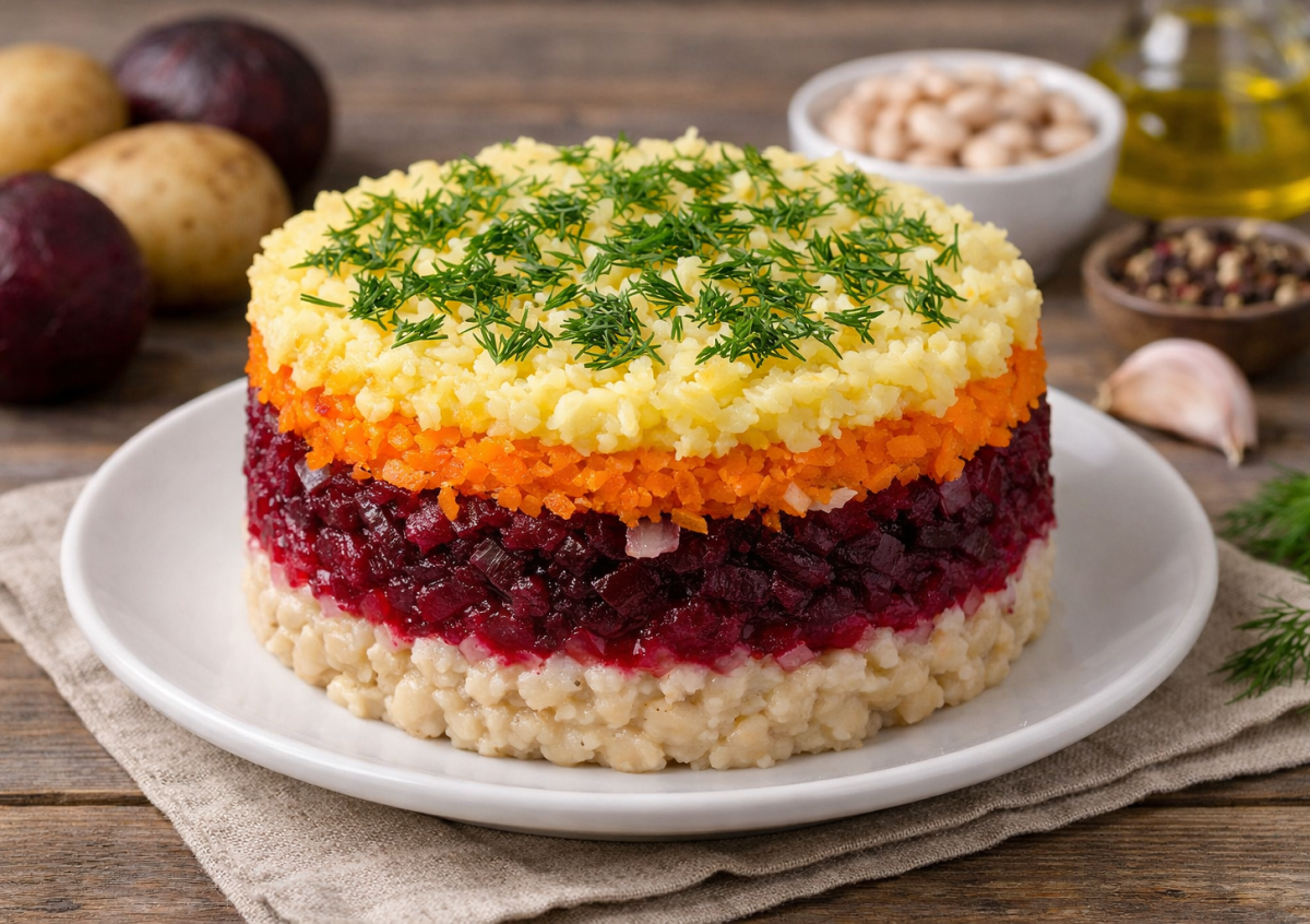 Этот постный слоеный салат собирается слоями, как торт: каждый вкус усиливает другой. Возьмите 2 свеклы, 3 картофелины, 2 моркови, 2 луковицы, 200 г фасоли (из банки), соль, перец. Отварите овощи, натрите на терке. Первый слой — пюре из фасоли с солью. Сверху — свекла, смешанная с измельченным луком. Затем морковь с чесноком (1 зубчик). Картофель — финал, присыпьте зеленью. Дайте пропитаться 2 часа в холодильнике. Калорийность порции — всего 150 ккал. Такой салат богат витаминами, клетчаткой, поддерживает фигуру в пост.