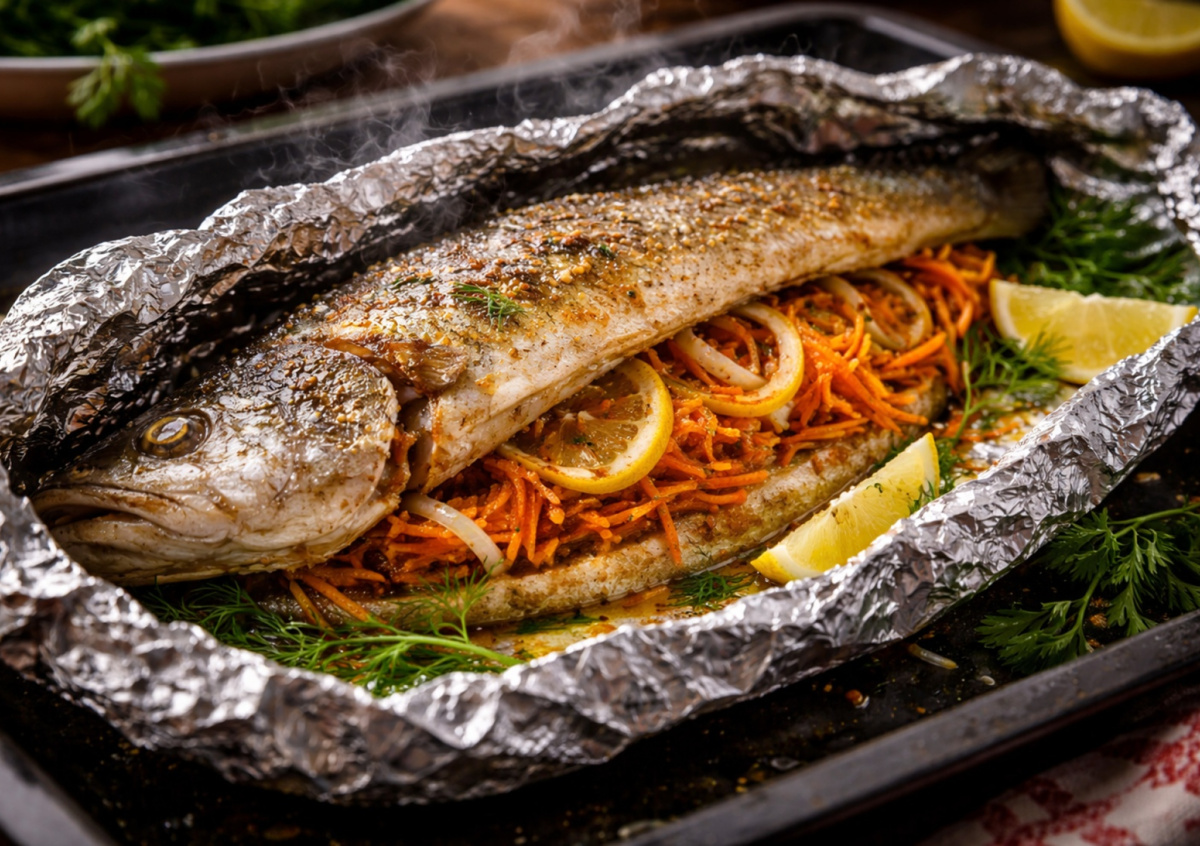 Рыбу (800 г) очистите, промойте и обсушите. Сделайте неглубокие надрезы на тушке, натрите соевым соусом (1 ст. л.), перцем (по вкусу) и чесноком (2 зубчика). В брюшко и на спинку выложите морковь по-корейски, кольца лука (1 шт.) и дольки лимона (3–4 дольки). Сбрызните маслом (растительное — 1 ч. л.), плотно заверните в фольгу и запекайте при 180 °C около 30–35 минут. За 5 минут до готовности можно раскрыть фольгу, чтобы появилась легкая румяная корочка.