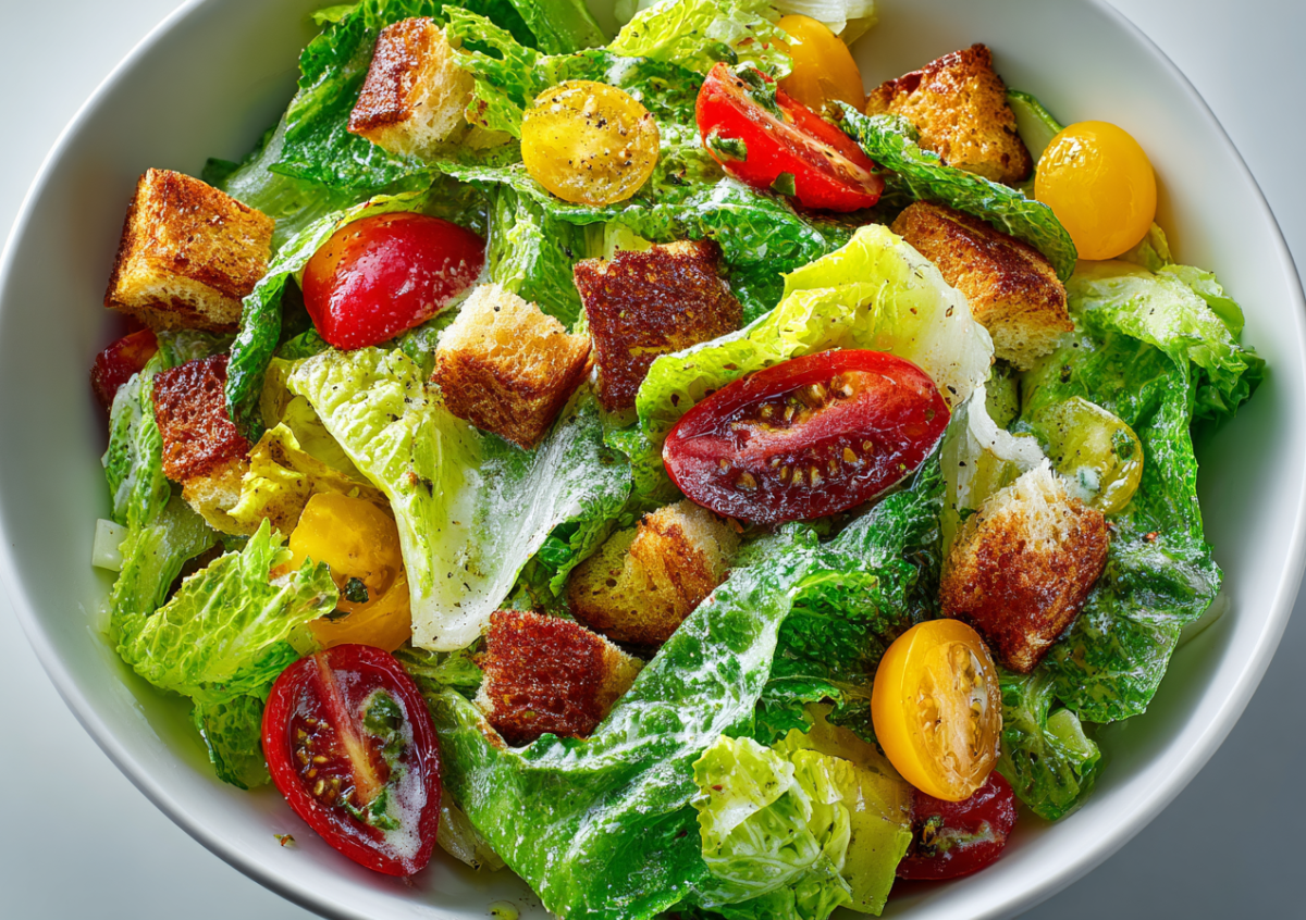 Для вкусного постного салата цезарь понадобятся: 200 г романо, 150 г черри, 4 кусочка белого хлеба и 1 ст. л. лимонного сока, а также по 1 ч. л. горчицы и немного соли по вкусу. Листья салата нарезаете крупными кусками, хлеб — кубиками, а помидоры — на две или четыре части. Хлеб подсушиваете в духовке до хрустящей корочки. Для заправки смешиваете лимонный сок, горчицу, соль, хорошо взбиваете до однородности. Все соединяете в миске, добавляете сухарики и аккуратно перемешиваете, чтобы все ингредиенты насытились ароматом, а сухарики остались хрустящими. В результате выходит свежий и воздушный постный салат, который отлично подойдет для праздничного стола в сочельник.