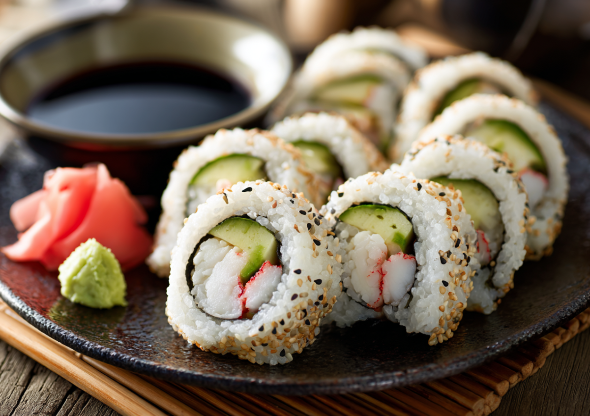 Нужны 150 г крабовых палочек, нарезанных тонко. Положите на лист нори 2 ст. л. риса, сваренного заранее. Сверху выложите крабовые палочки, авокадо ломтиками и огурчик соломкой. Посыпьте кунжутом для аромата. Сверните туго, смочите край водой и нарежьте рулет порционно. Подходит для фуршета или обеда. Добавьте васаби для остроты — гости будут в восторге.
