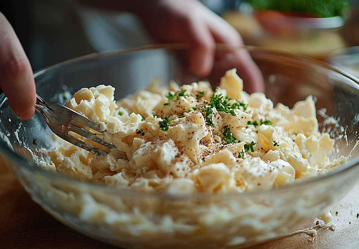 - Печень трески измельчаем вилкой в салатнике. К рыбе добавляем тертый сыр, лук, нарезанные кубиками яйца и заправляем майонезом.