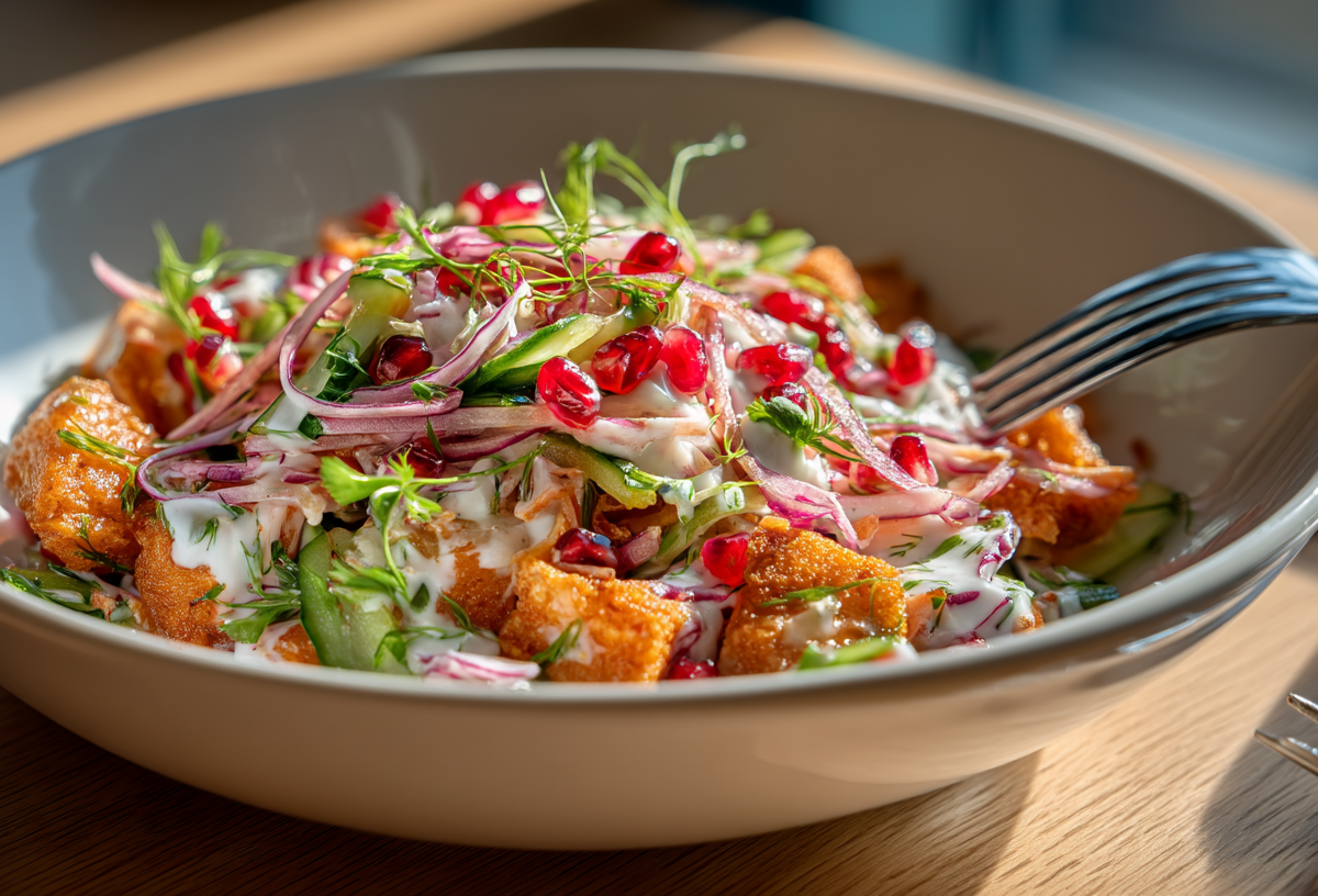 Этот яркий салат покорил Стамбул несколько лет назад и быстро разлетелся по домашним кухням Турции. Главная фишка — обжаренные во фритюре крабовые палочки, которые становятся хрустящими снаружи и нежными внутри. Сочетание с гранатовыми зернами создает неожиданный контраст вкусов.