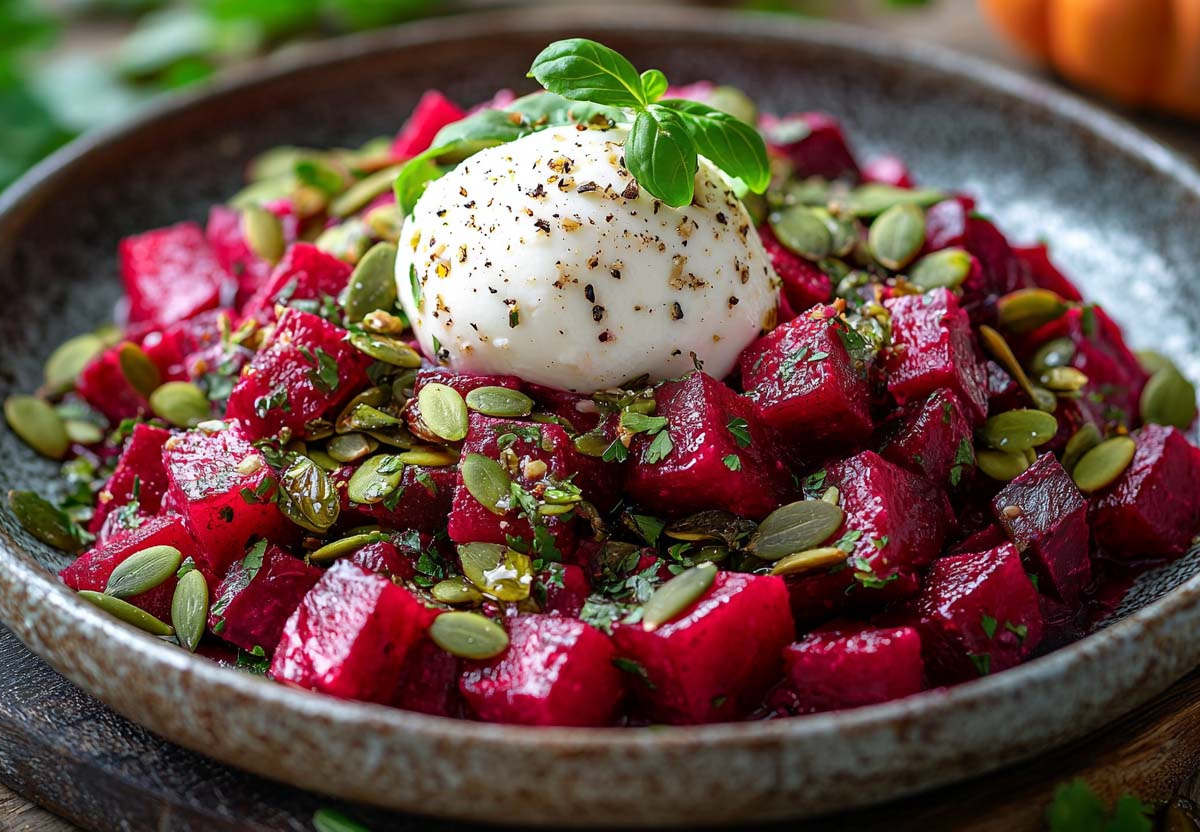Две средние свеклы очистите и нарежьте кубиками по 2 см. Сбрызните их не просто маслом, а смесью оливкового масла и чайной ложки гранатовой патоки (наршараба) — это даст карамелизацию. Обжарьте на сильно разогретой сковороде до поджаристой корочки, но оставьте внутри мягкими. Дайте полностью остыть. Для заправки взбейте в блендере столовую ложку белого урбеча (паста из семян льна), сок половины апельсина, щепотку соли и молотого кардамона. Доведите до консистенции жидкой сметаны, добавляя ледяную воду. Выложите остывшую свеклу на тарелку, сверху разорвите руками шарик моцареллы или броссин. Сбрызните заправкой и посыпьте поджаренными тыквенными семечками и цедрой апельсина.
